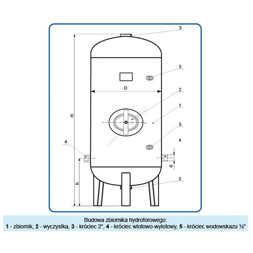Zbiornik przeznaczony jest do przechowywania i tłoczenia wody pitnej za pomocą poduszki powietrznej. Jest ona wytwarzana przez sprężanie znajdującego się w zbiorniku powietrza przy napełnianiu go wodą. Sprężone powietrze działa tak jak tłok na lustro wody, wytłaczając je ze zbiornika. Doprowadzenie i odprowadzenie wody odbywa się przez dwa oddzielne króćce w dolnej części zbiornika.
